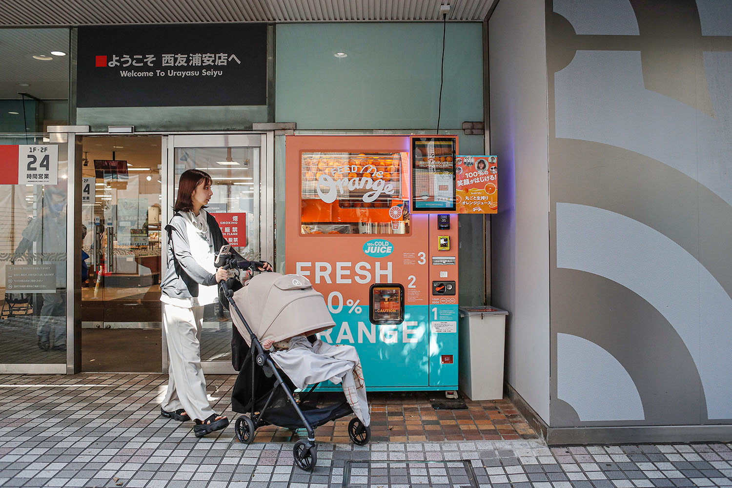 When you're thirsty, you can find fresh orange juice squeezed from real fruit in machines in the Urayasu area. Exploring Akihabara, you'll find vending machines selling toys, photo ID cards, and lockers of various sizes.